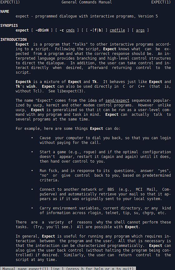 Expect zawiera program do prowadzenia skryptowych dialogów z innymi interaktywnymi programami. Expect to narzędzie do automatyzacji aplikacji interaktywnych zgodnie ze skryptem. Po skrypcie program Expect wie, czego można oczekiwać od programu i czego prawidłowa odpowiedź powinna być. Oczekiwanie jest również przydatne do testowania tych samych aplikacji. Dodając Tk, możesz także łączyć aplikacje interaktywne GUI X11. Zinterpretowany język zapewnia rozgałęzienia i kontrolę wysokiego poziomu struktury kierujące dialogiem. Ponadto użytkownik może przejąć kontrolę i w razie potrzeby współdziałają bezpośrednio, a następnie zwracają kontrolę nad skryptem. Ten pakiet zawiera oczekiwane skrypty binarne i kilka skryptów opartych na oczekiwaniach. Expect napisał Don Libes z National Institute of Standards and Technology. |