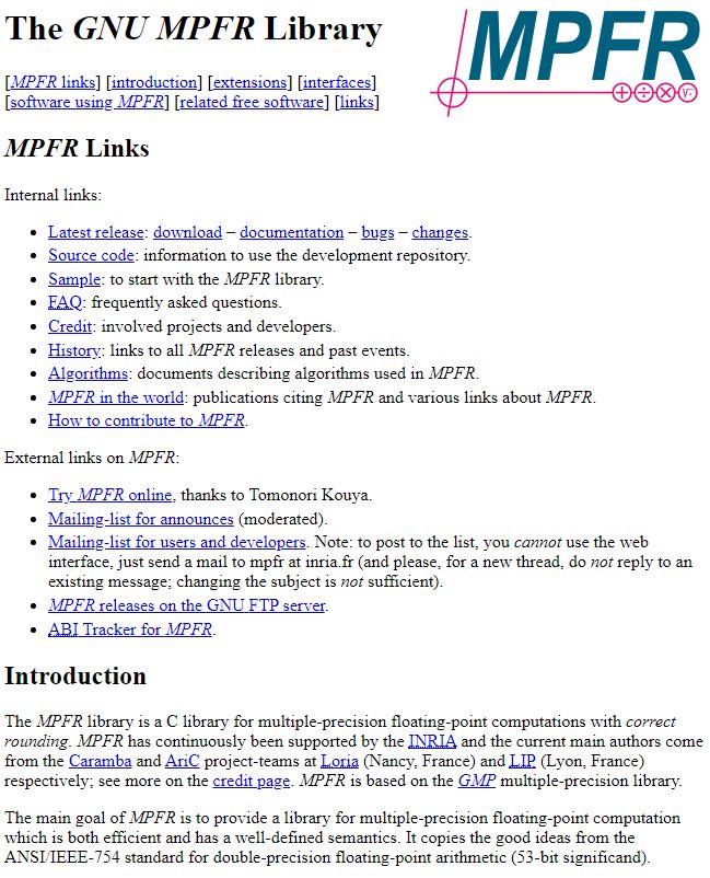 Pakiet MPFR zawiera funkcje matematyki wielokrotnej precyzji. Biblioteka MPFR jest biblioteką C dla zmiennoprzecinkowego o wielu precyzjach obliczenia z dokładnym zaokrągleniem (zwane również poprawnym zaokrąglaniem). Opiera się na wieloprecyzyjnej bibliotece GMP. Głównym celem MPFR jest zapewnienie biblioteki dla wielu precyzji obliczenia zmiennoprzecinkowe, które są zarówno wydajne, jak i mają dobrze zdefiniowana semantyka. Kopiuje dobre pomysły z Norma ANSI/IEEE-754 dla arytmetyki zmiennoprzecinkowej podwójnej precyzji (53-bitowa mantysa). Ten pakiet jest także używany przez GCC (kompilator GNU C). |