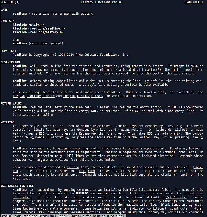 Readline to zestaw bibliotek, który oferuje funkcje edycji wiersza poleceń i historii, dającą możliwość korzystania z takich funkcji jak: -pełna edycja linii poleceń; -edycja i przeszukiwanie historii; -dopełnianie nazw i adresów (ang. command line completion); Stosowana jest w programach takich jak bash i innych stosujących linię poleceń. Biblioteka GNU Readline zapewnia zestaw funkcji do wykorzystania przez aplikacje, które pozwalają użytkownikom edytować wiersze poleceń podczas pisania. Dostępne są tryby edycji Emacsa i vi. Readline biblioteka zawiera dodatkowe funkcje do obsługi listy poprzednio wprowadził wiersze poleceń, aby przywołać i być może edytować te wiersze oraz wykonaj podobną do csh ekspansję historii na poprzednich komendach. |